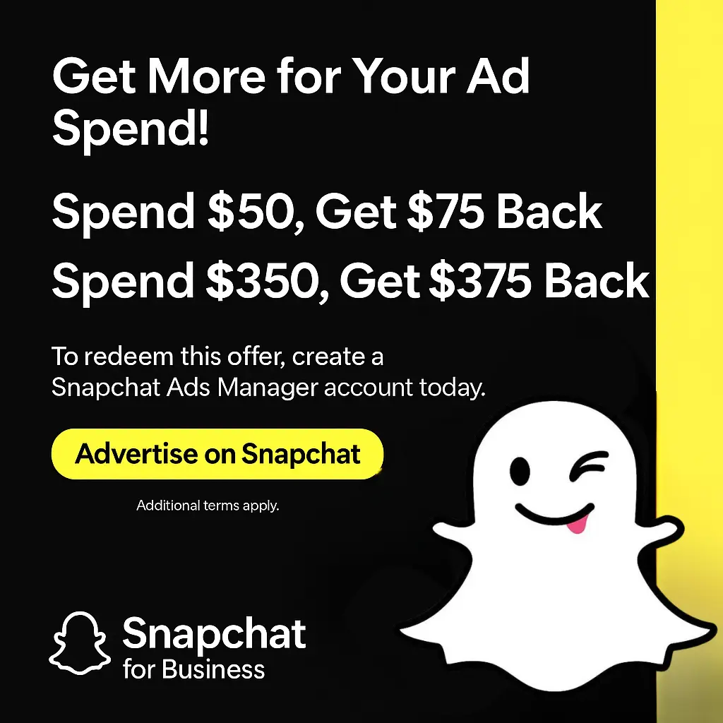 If you've never advertised on Snapchat before, this is basically free money waiting for you. With up to $375 in bonus ad credit, you can run extensive tests to see how the platform performs for your specific business.